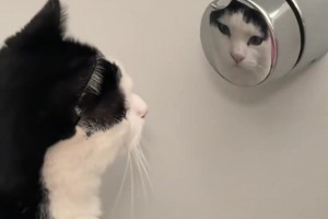 猫咪聚精会神盯着“镜子”中的自己