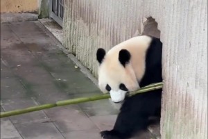 大熊猫叼竹子下班 灵活“倒车”丝滑入门