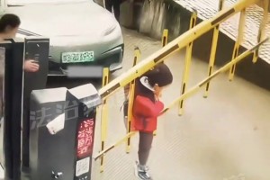 男孩调皮钻道闸遇到进车 道闸升起直接“举高高”